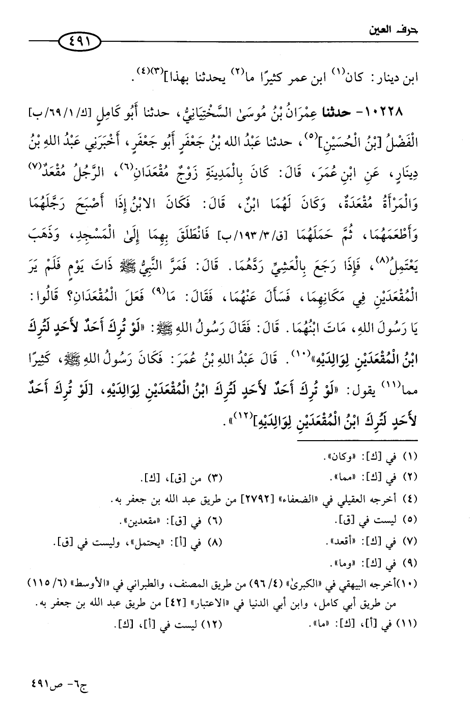 10228 - حَدثنا عمران بن موسي السختياني، حَدثنا أَبو كامل الفضل بن الحسين، حَدثنا عَبد الله بن جعفر أَبو جعفر، أخبرني عَبد الله بن دينار، عن ابن عُمر، قال: كان بالمدينة زوج مقعدان، الرَجُل مقعد والمرأة مقعدة، وكان لهما ابن، قال: فكان الابن إذا أصبح رَجَلْهُمَا وأطعمهما ثم حملهما، فانطلق بهما إلي المسجد، وذهب يعتمل، فإذا رجع بالعشي ردهما، قال: فمر النبي صَلي الله عَليه وسلم ذات يوم فلم ير المقعدين في مكانهما، فسأل عنهما، فقال: ما فعل المقعدان؟ قالوا: يا رسول الله مات ابنهما، قال: فَقال رسول الله صَلي الله عَليه وسَلم: لو تُرِك أحد لأحد لتُرِك ابن المقعدين لوالديه، قال عَبد الله بن عُمر: فكان رسول الله صَلي الله عَليه وسَلم كثيرًا مما يقول: لو تُرِك أحد لأحد لتُرِك ابن المقعدين لوالديه، لو تُرِك أحد لأحد لتُرِك ابن المقعدين لوالديه.