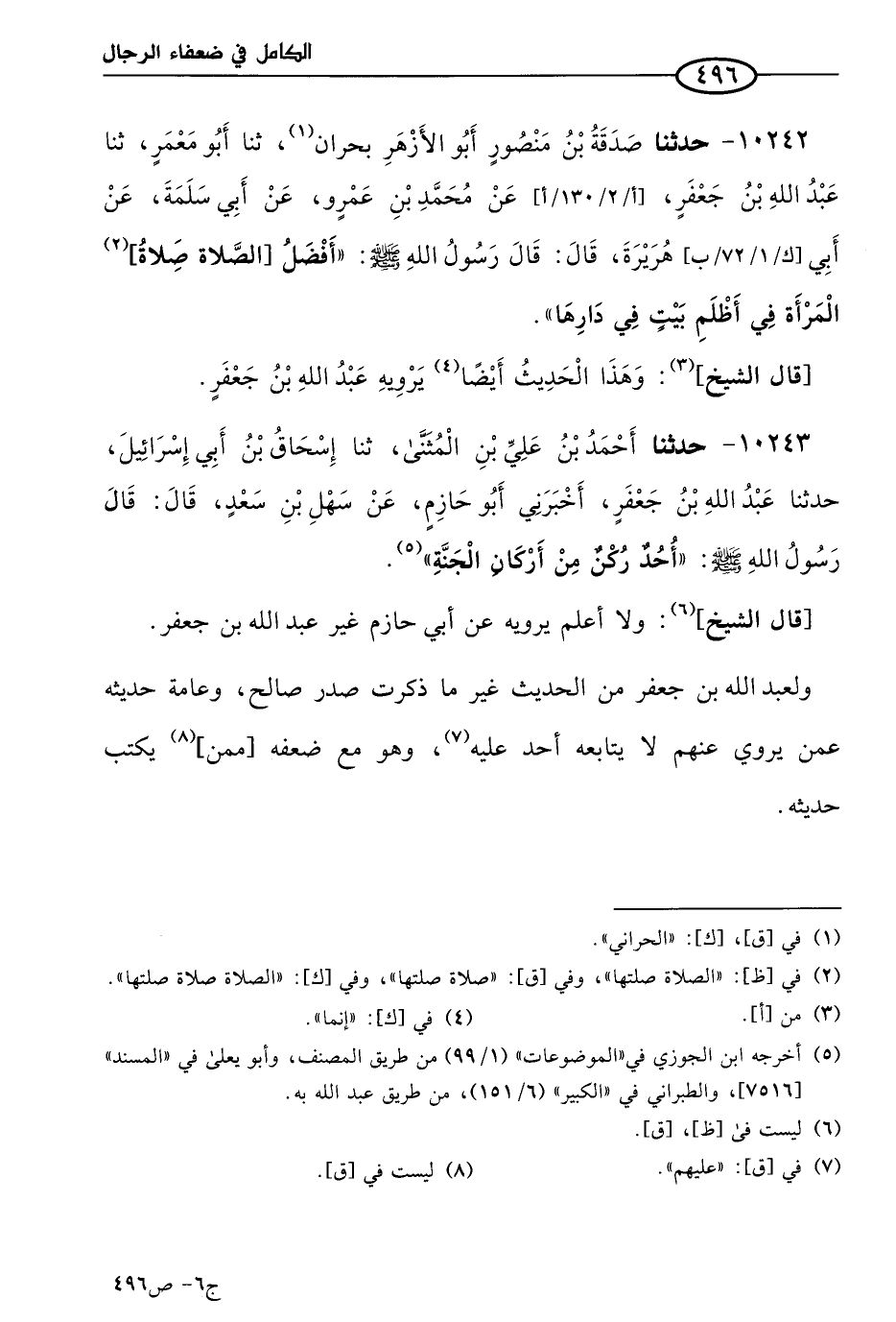 10242 - حَدثنا صدقة بن منصور أَبو الأزهر بحران، حَدثنا أَبو معمر، حَدثنا عَبد الله بن جعفر، عن مُحمد بن عَمرو، عن أبي سلمة، عن أبي هريرة، قال: قال رسول الله صَلي الله عَليه وسَلم: أفضل الصلاة صلاة المرأة في أظلم بيت في دارها.