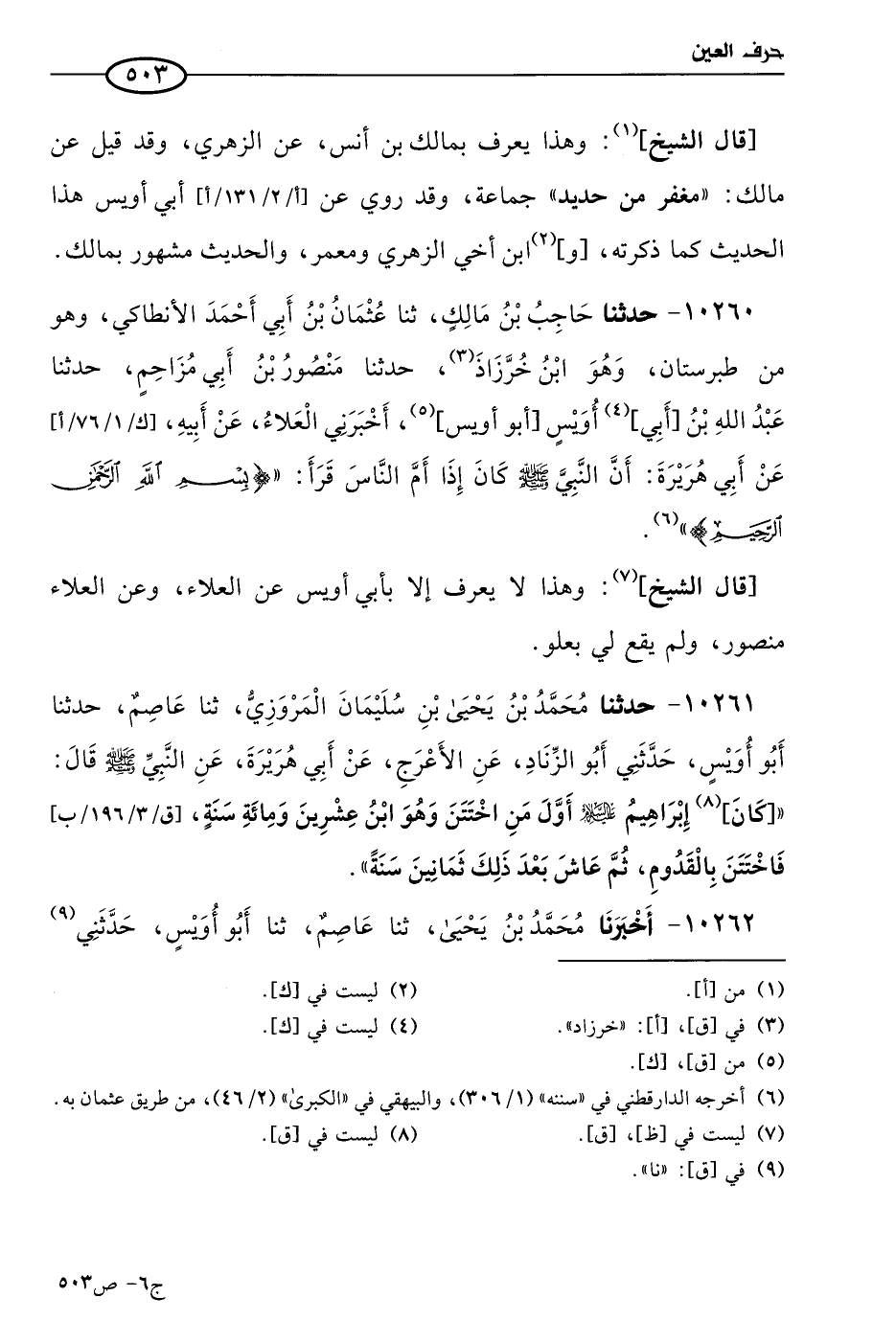 10261 - حَدثنا مُحمد بن يَحيي بن سليمان المروزي، حَدثنا عاصم، حَدثنا أَبو أويس، حَدَّثني أَبو الزناد، عن الأعرج، عن أبي هريرة، عن النبي صَلي الله عَليه وسلم، قال: كان إبراهيم عليه السلام أول من اختتن، وهو ابن عشرين ومِائَة سنة، فاختتن بالقدوم ثم عاش بعد ذلك ثمانين سنة.