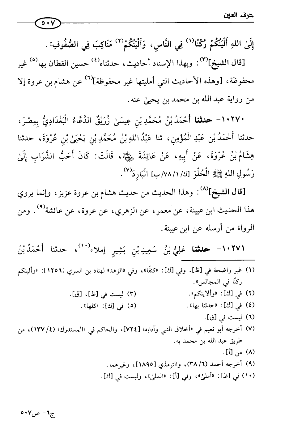 10270 - حَدثنا أحمد بن مُحمد بن عيسي زريق الدعاء البغدادي بمصر، حَدثنا أحمد بن عَبد المؤمن، حَدثنا عَبد الله بن مُحمد بن يَحيي بن عروة، حَدثنا هشام بن عروة، عن أبيه، عن عائشة رضي الله عنها، قالت: كان أحب الشراب إلي رسول الله صَلي الله عَليه وسَلم الحلو البارد.