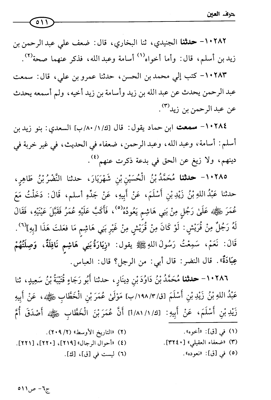 10284 - سمعتُ ابن حماد يقول: قال السعدي: بنو زيد بن أسلم: أسامة، وعَبد الله، وعَبد الرحمن ضعفاء في الحديث، في غير خربة في دينهم، ولا زيغ عن الحق في بدعة ذكرت عنهم.