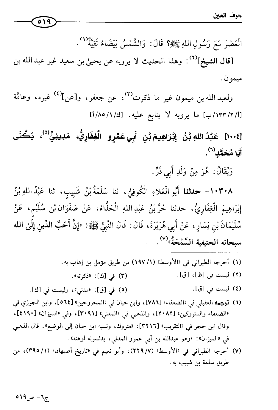 10308 - حَدثنا أَبو العلاء الكوفي، حَدثنا سلمة بن شبيب، حَدثنا عَبد الله بن إبراهيم الغفاري، حَدثنا حر بن عَبد الله الحذاء، عن صفوان بن سليم، عن سليمان عن يسار، عن أبي هريرة، قال: قال النبي صَلي الله عَليه وسلم: إن أحب الدين إلي الله سبحانه الحنفية السمحة.