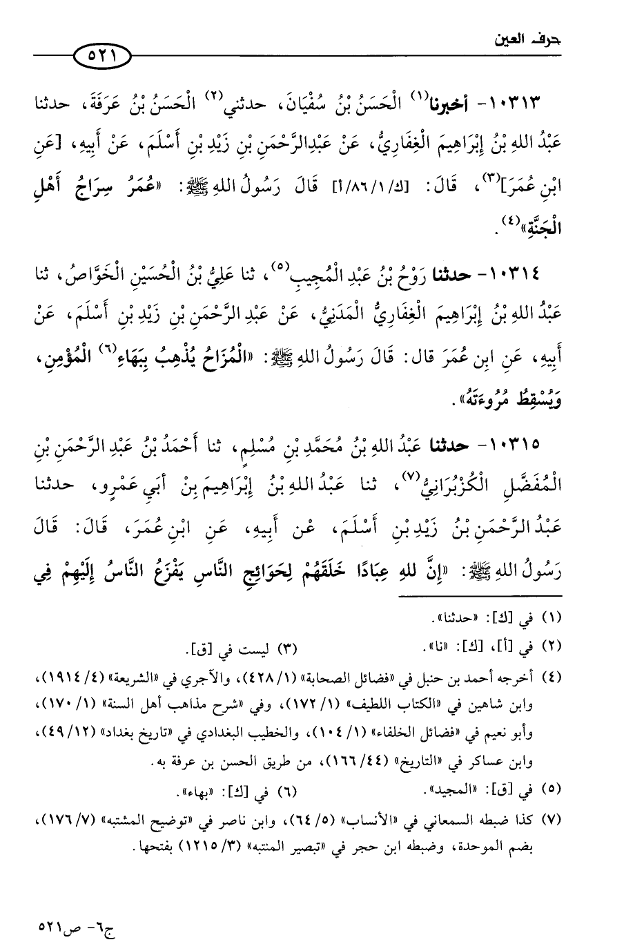 10313 - أخبرنا الحسن بن سفيان، حَدثني الحسن بن عرفة، حَدثنا عَبد الله بن إبراهيم الغفاري، عن عَبد الرحمن بن زيد بن أسلم، عن أبيه، عن ابن عُمر، قال: قال رسول الله صَلي الله عَليه وسَلم: عُمر سراج أهل الجنة.