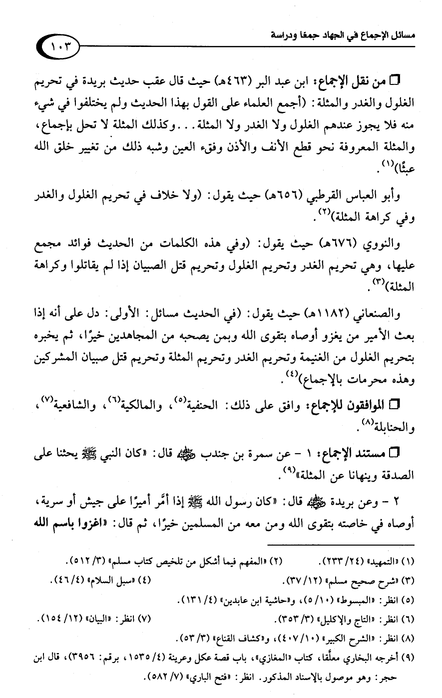 • من نقل الإجماع: ابن عبد البر (463 هـ) حيث قال عقب حديث بريدة في تحريم الغلول والغدر والمثلة: (أجمع العلماء على القول بهذا الحديث ولم يختلفوا في شيء منه فلا يجوز عندهم الغلول ولا الغدر ولا المثلة. . . وكذلك المثلة لا تحل بإجماع، والمثلة المعروفة نحو قطع الأنف والأذن وفقء العين وشبه ذلك من تغيير خلق اللَّه عبثًا) (¬1).