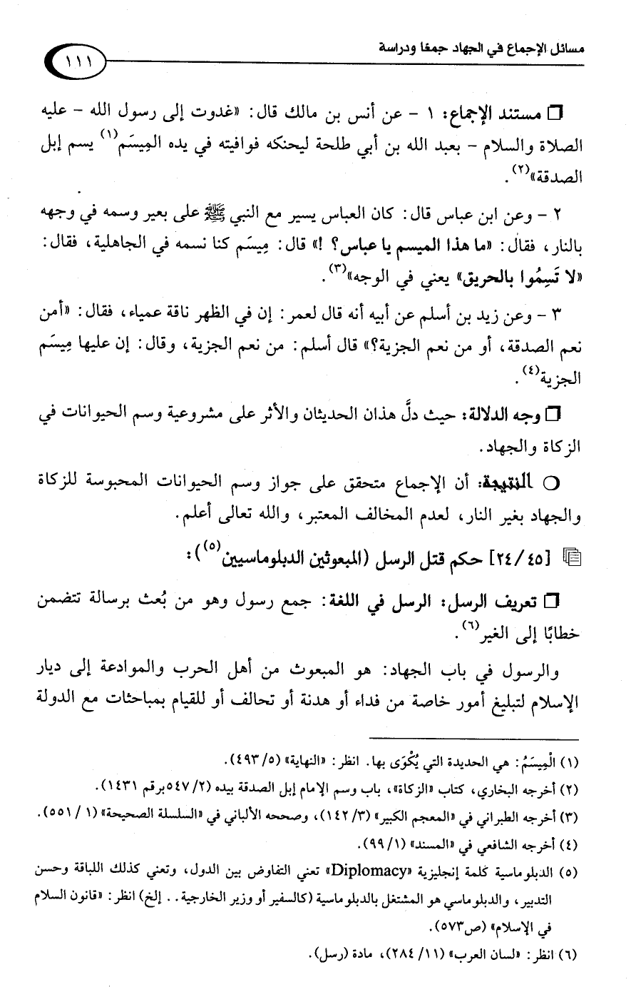 • وجه الدلالة: حيث دل هذان الحديثان والأثر على مشروعية وسم الحيوانات في الزكاة والجهاد.Rأن الإجماع متحقق على جواز وسم الحيوانات المحبوسة للزكاة والجهاد بغير النار، لعدم المخالف المعتبر، واللَّه تعالى أعلم.