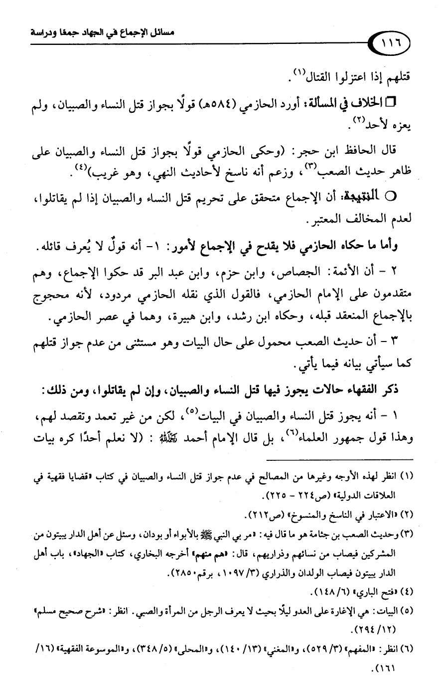قال الحافظ ابن حجر: (وحكى الحازمي قولًا بجواز قتل النساء والصبيان على ظاهر حديث الصعب (¬3)، وزعم أنه ناسخ لأحاديث النهي، وهو غريب) (¬4).Rأن الإجماع متحقق على تحريم قتل النساء والصبيان إذا لم يقاتلوا، لعدم المخالف المعتبر.