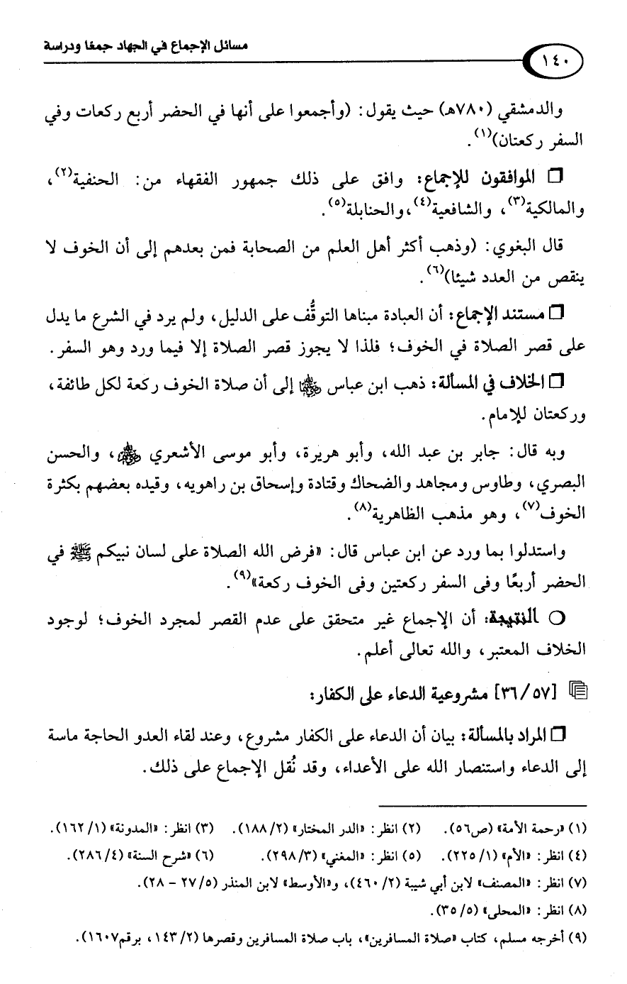 واستدلوا بما ورد عن ابن عباس قال: "فرض اللَّه الصلاة على لسان نبيكم -صلى اللَّه عليه وسلم- في الحضر أربعًا وفى السفر ركعتين وفى الخوف ركعة" (¬9).Rأن الإجماع غير متحقق على عدم القصر لمجرد الخوف؛ لوجود الخلاف المعتبر، واللَّه تعالى أعلم.