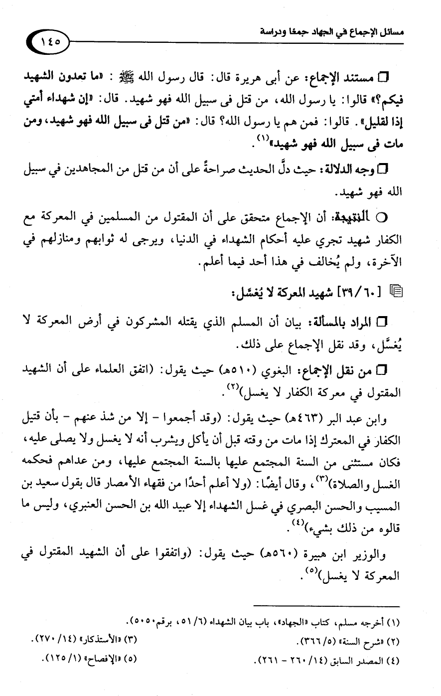والوزير ابن هبيرة (560 هـ) حيث يقول: (واتفقوا على أن الشهيد المقتول في المعركة لا يغسل) (¬5).
