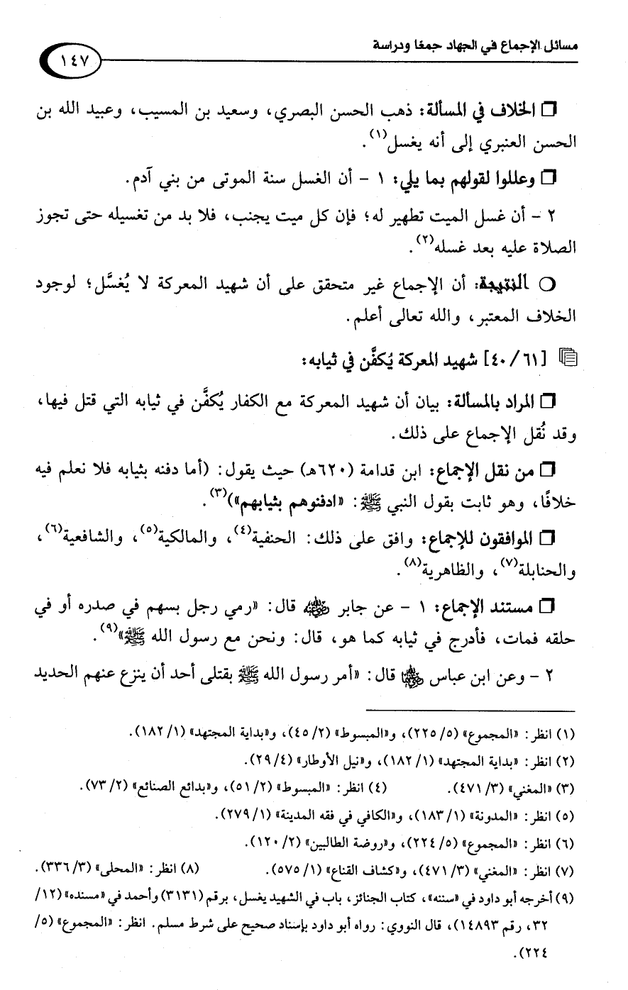 • من نقل الإجماع: ابن قدامة (620 هـ) حيث يقول: (أما دفنه بثيابه فلا نعلم فيه خلافًا، وهو ثابت بقول النبي -صلى اللَّه عليه وسلم-: "ادفنوهم بثيابهم") (¬3).