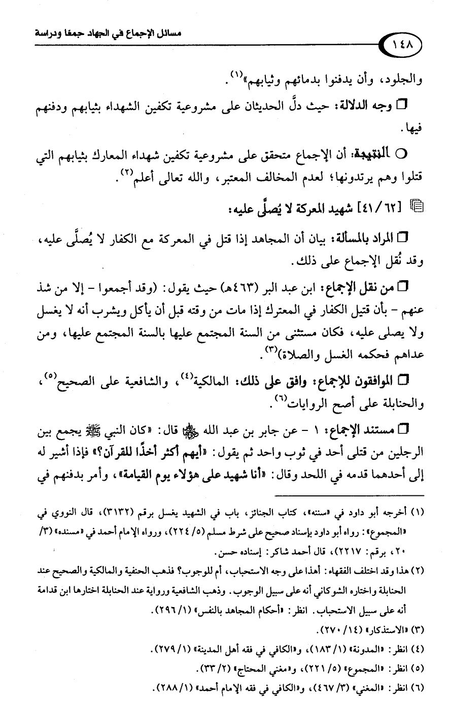 • وجه الدلالة: حيث دلَّ الحديثان على مشروعية تكفين الشهداء بثيابهم ودفنهم فيها.Rأن الإجماع متحقق على مشروعية تكفين شهداء المعارك بثيابهم التي قتلوا وهم يرتدونها؛ لعدم المخالف المعتبر، واللَّه تعالى أعلم (¬2).