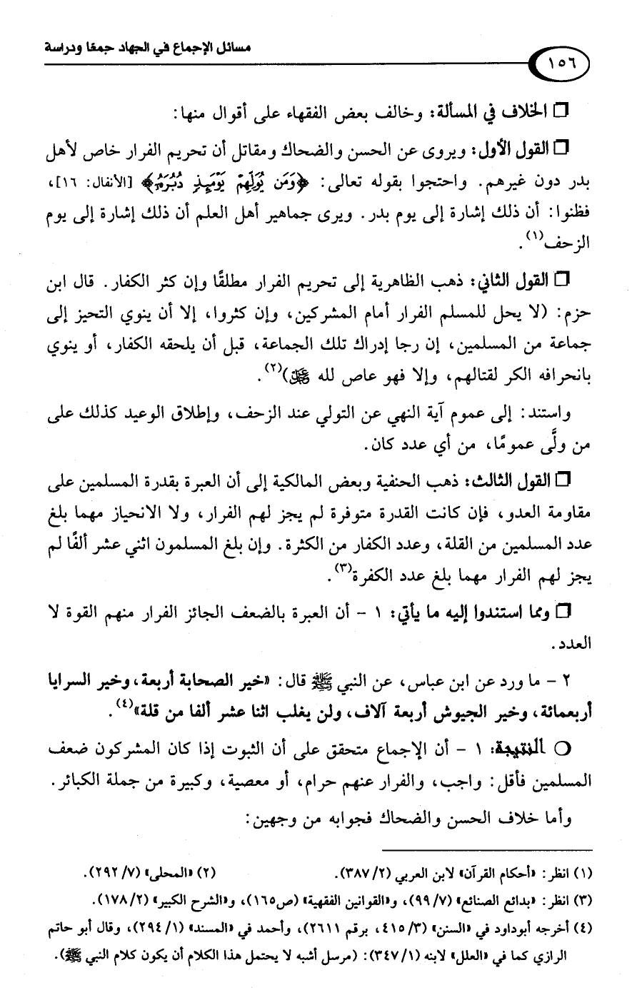 2 - ما ورد عن ابن عباس، عن النبي -صلى اللَّه عليه وسلم- قال: "خير الصحابة أربعة، وخير السرايا أربعمائة، وخير الجيوش أربعة آلاف، ولن يغلب اثنا عشر ألفا من قلة" (¬4). R 1 - أن الإجماع متحقق على أن الثبوت إذا كان المشركون ضعف المسلمين فأقل: واجب، والفرار عنهم حرام، أو معصية، وكبيرة من جملة الكبائر.