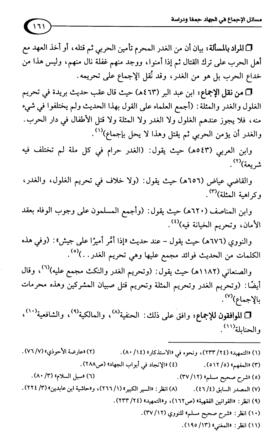 • من نقل الإجماع: ابن عبد البر (463 هـ) حيث قال عقب حديث بريدة في تحريم الغلول والغدر والمثلة: (أجمع العلماء على القول بهذا الحديث ولم يختلفوا في شيء منه، فلا يجوز عندهم الغلول ولا الغدر ولا المثلة ولا قتل الأطفال في دار الحرب. والغدر أن يؤمن الحربي ثم يقتل وهذا لا يحل بإجماع) (¬1).