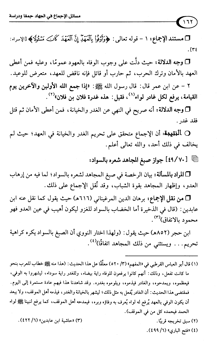 ابن حجر (852 هـ) حيث يقول: (ولهذا اختار النووي أن الصبغ بالسواد يكره كراهية تحريم. . . ويستثني من ذلك المجاهد اتفاقًا) (¬4).