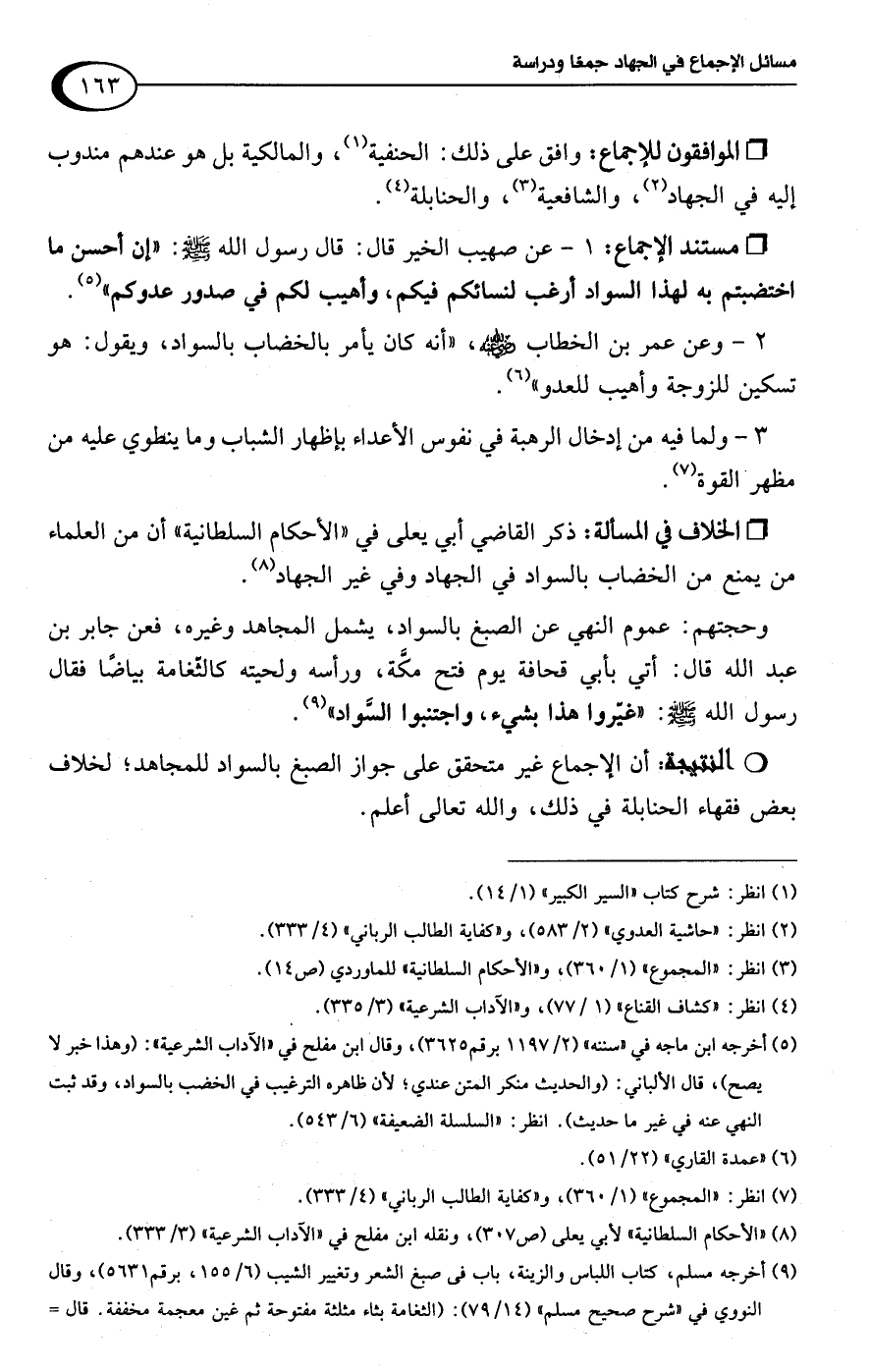وحجتهم: عموم النهي عن الصبغ بالسواد، يشمل المجاهد وغيره، فعن جابر بن عبد اللَّه قال: أتي بأبي قحافة يوم فتح مكة، ورأسه ولحيته كالثغامة بياضًا فقال رسول اللَّه -صلى اللَّه عليه وسلم-: "غيروا هذا بشيء، واجتنبوا السَّواد" (¬9).Rأن الإجماع غير متحقق على جواز الصبغ بالسواد للمجاهد؛ لخلاف بعض فقهاء الحنابلة في ذلك، واللَّه تعالى أعلم.