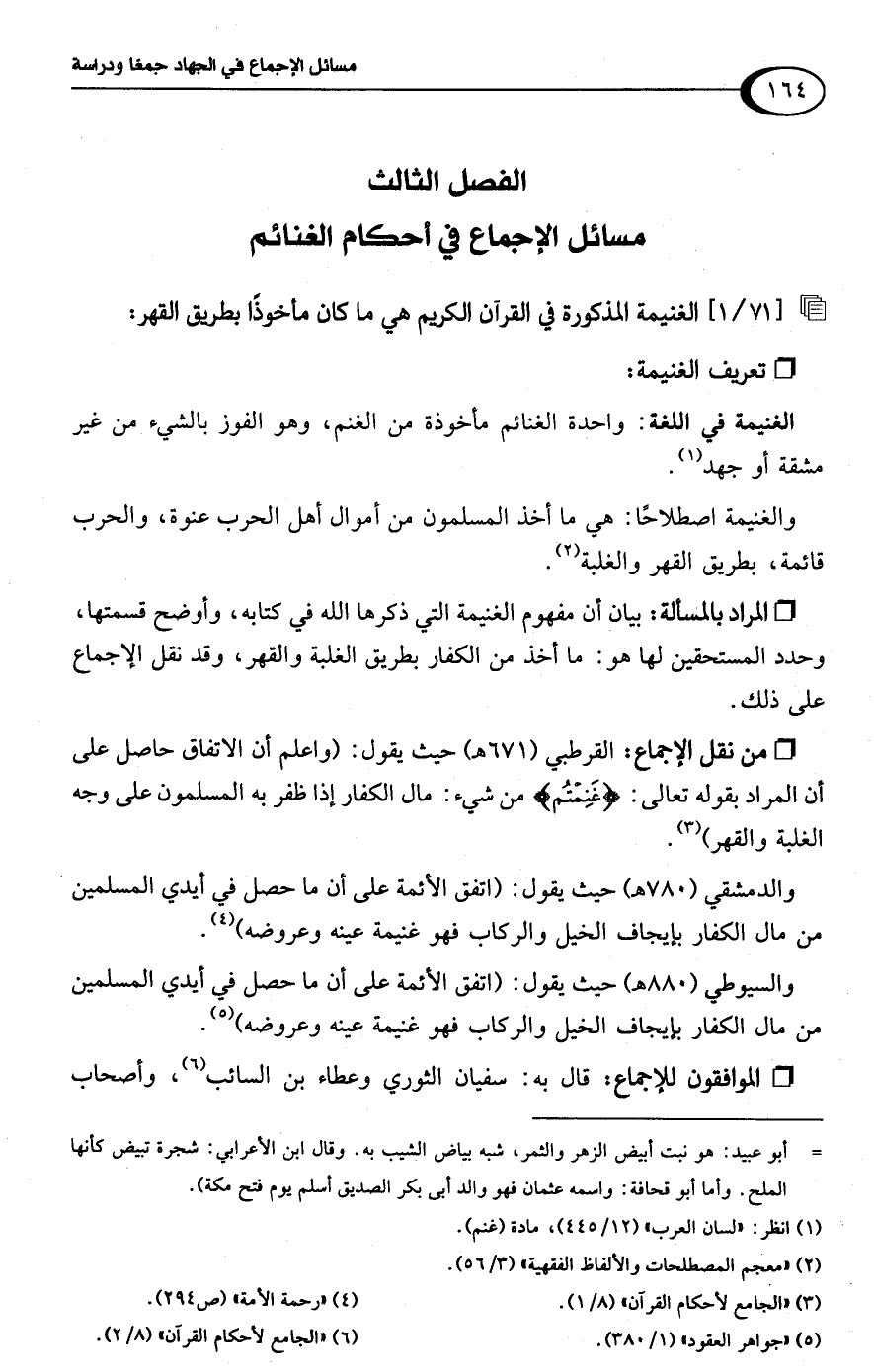 • من نقل الإجماع: القرطبي (671 هـ) حيث يقول: (واعلم أن الاتفاق حاصل على أن المراد بقوله تعالى: {غَنِمْتُمْ} من شيء: مال الكفار إذا ظفر به المسلمون على وجه الغلبة والقهر) (¬3).