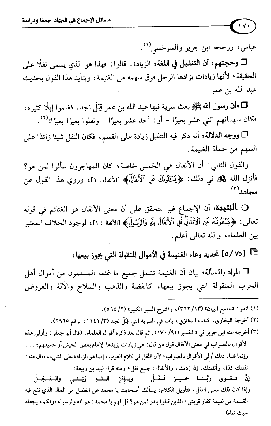 • وحجتهم: أن التنفيل في اللغة: الزيادة. قالوا: فهذا هو الذي يسمى نفلًا على الحقيقة؛ لأنها زيادات يزادها الرجل فوق سهمه من الغنيمة، ويتأيد هذا القول بحديث عبد اللَّه بن عمر: