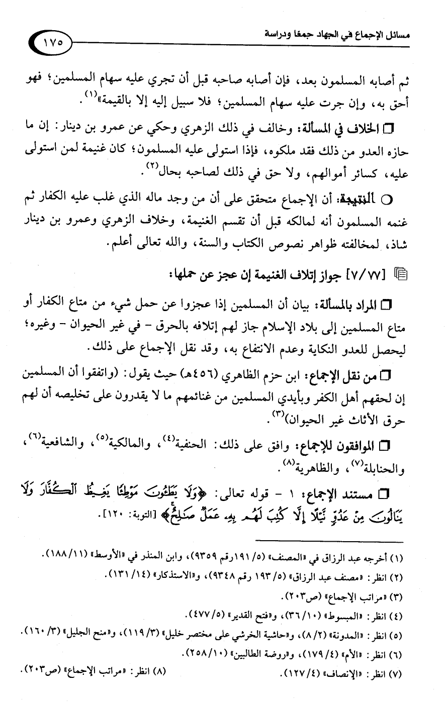 • من نقل الإجماع: ابن حزم الظاهري (456 هـ) حيث يقول: (واتفقوا أن المسلمين إن لحقهم أهل الكفر وبأيدي المسلمين من غنائمهم ما لا يقدرون على تخليصه أن لهم حرق الأثاث غير الحيوان) (¬3).