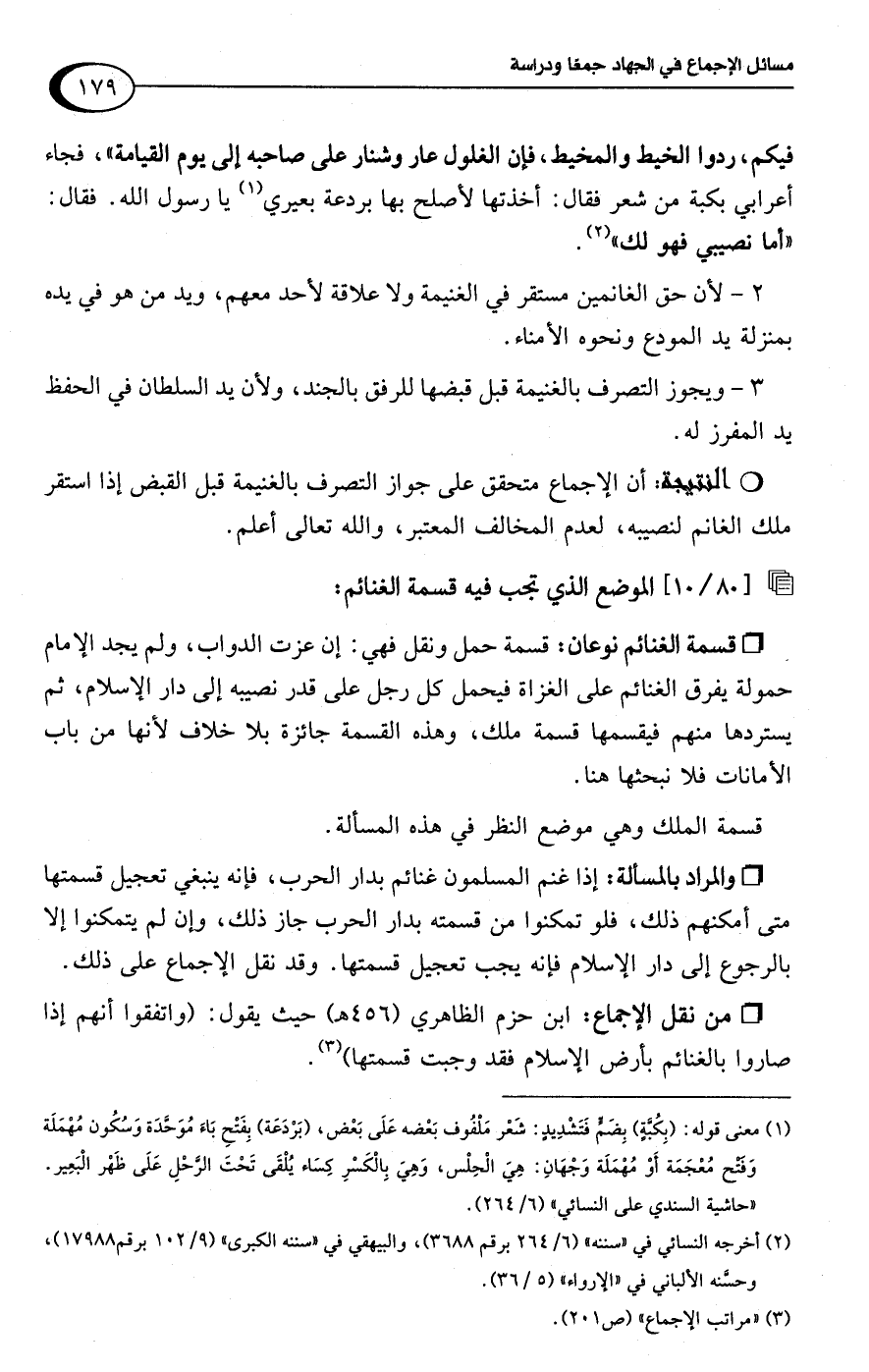 • من نقل الإجماع: ابن حزم الظاهري (456 هـ) حيث يقول: (واتفقوا أنهم إذا صاروا بالغنائم بأرض الإِسلام فقد وجبت قسمتها) (¬3).