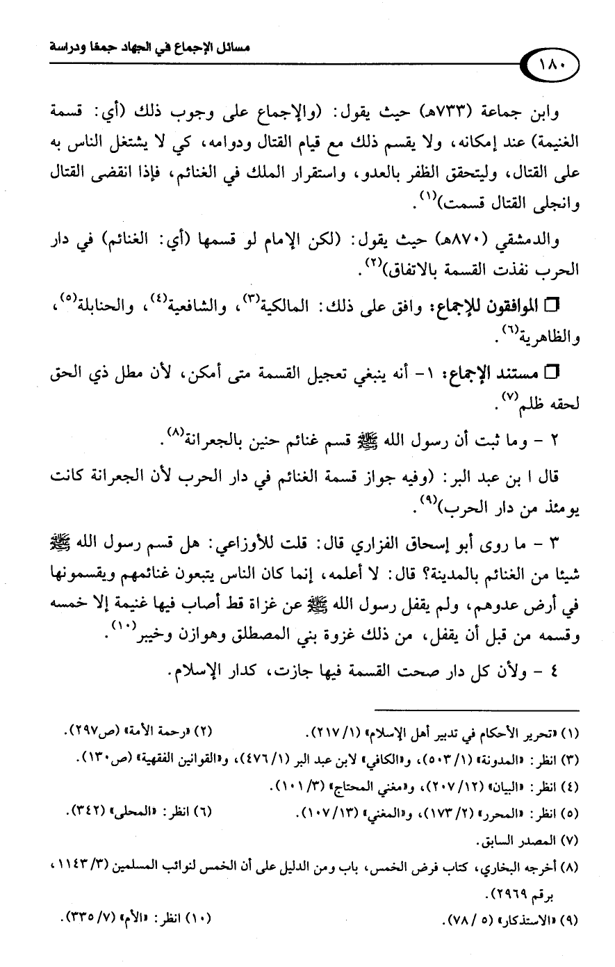 وابن جماعة (733 هـ) حيث يقول: (والإجماع على وجوب ذلك (أي: قسمة الغنيمة) عند إمكانه، ولا يقسم ذلك مع قيام القتال ودوامه، كي لا يشتغل الناس به على القتال، وليتحقق الظفر بالعدو، واستقرار الملك في الغنائم، فإذا انقضى القتال وانجلى القتال قسمت) (¬1).