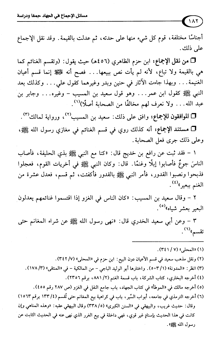 • من نقل الإجماع: ابن حزم الظاهري (456 هـ) حيث يقول: (وتقسم الغنائم كما هي بالقيمة ولا تباع، لأنه لم يأت نص ببيعها. . . فصح أنه عليه السلام إنما قسم أعيان الغنيمة. . . وبهذا جاءت الآثار في حنين وبدر وغيرهما كقول علي. . . وكذلك بعد النبي -صلى اللَّه عليه وسلم- يقول ابن عمر. . . وهو قول سعيد بن المسيب- وغيره. . . وجابر بن عبد اللَّه. . . ولا نعرف لهم مخالفًا من الصحابة أصلًا) (¬1).