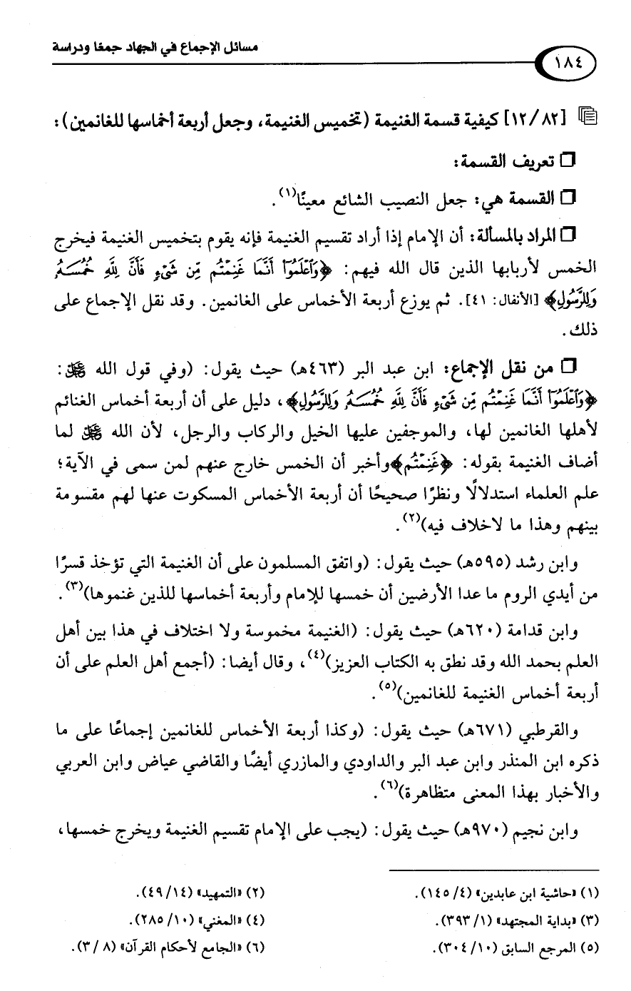 والقرطبي (671 هـ) حيث يقول: (وكذا أربعة الأخماس للغانمين إجماعًا على ما ذكره ابن المنذر وابن عبد البر والداودي والمازري أيضًا والقاضي عياض وابن العربي والأخبار بهذا المعنى متظاهرة) (¬6).