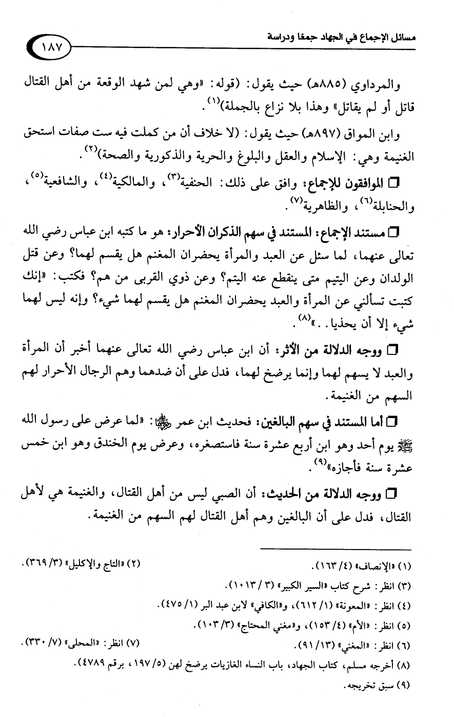 وابن المواق (897 هـ) حيث يقول: (لا خلاف أن من كملت فيه ست صفات استحق الغنيمة وهي: الإسلام والعقل والبلوغ والحرية والذكورية والصحة) (¬2).