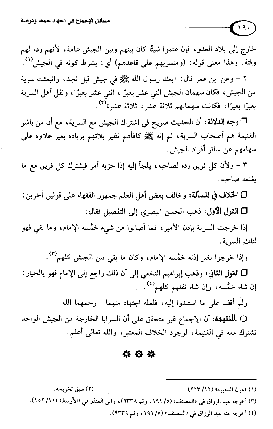 ولم أقف على ما استندوا إليه، فلعله اجتهاد منهما -رحمهما اللَّه.Rأن الإجماع غير متحقق على أن السرايا الخارجة من الجيش الواحد تشترك معه في الغنيمة، لوجود الخلاف المعتبر، واللَّه تعالى أعلم.