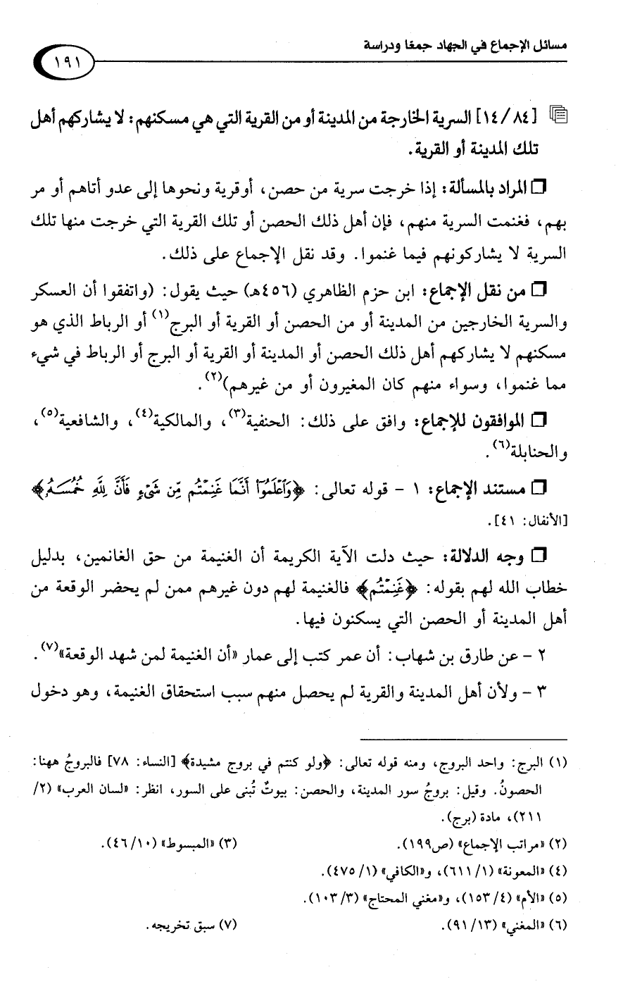 • من نقل الإجماع: ابن حزم الظاهري (456 هـ) حيث يقول: (واتفقوا أن العسكر والسرية الخارجين من المدينة أو من الحصن أو القرية أو البرج (¬1) أو الرباط لذي هو مسكنهم لا يشاركهم أهل ذلك الحصن أو المدينة أو القرية أو البرج أو الرباط في شيء مما غنموا، وسواء منهم كان المغيرون أو من غيرهم) (¬2).