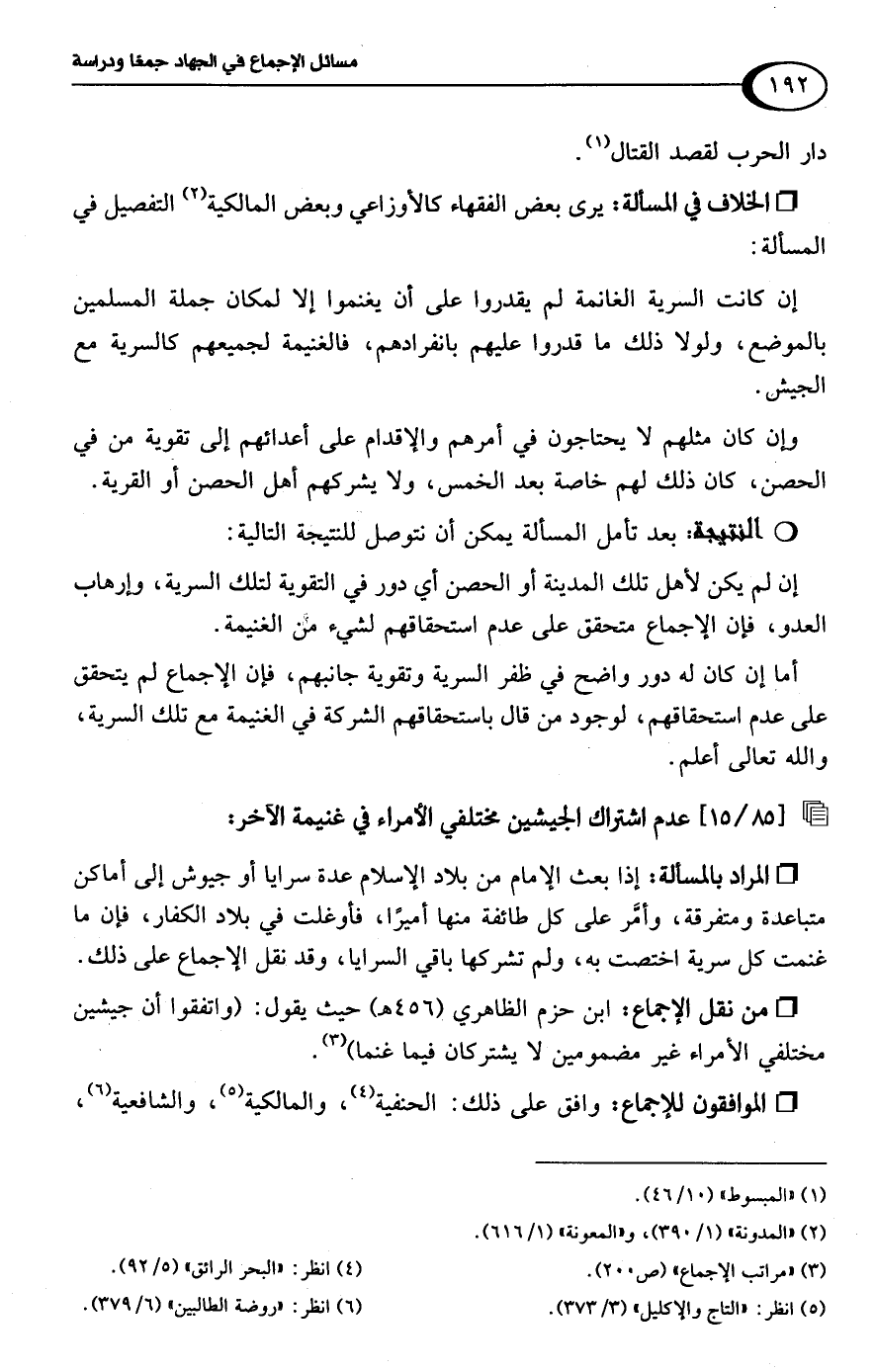• من نقل الإجماع: ابن حزم الظاهري (456 هـ) حيث يقول: (واتفقوا أن جيشين مختلفي الأمراء غير مضمومين لا يشتركان فيما غنما) (¬3).