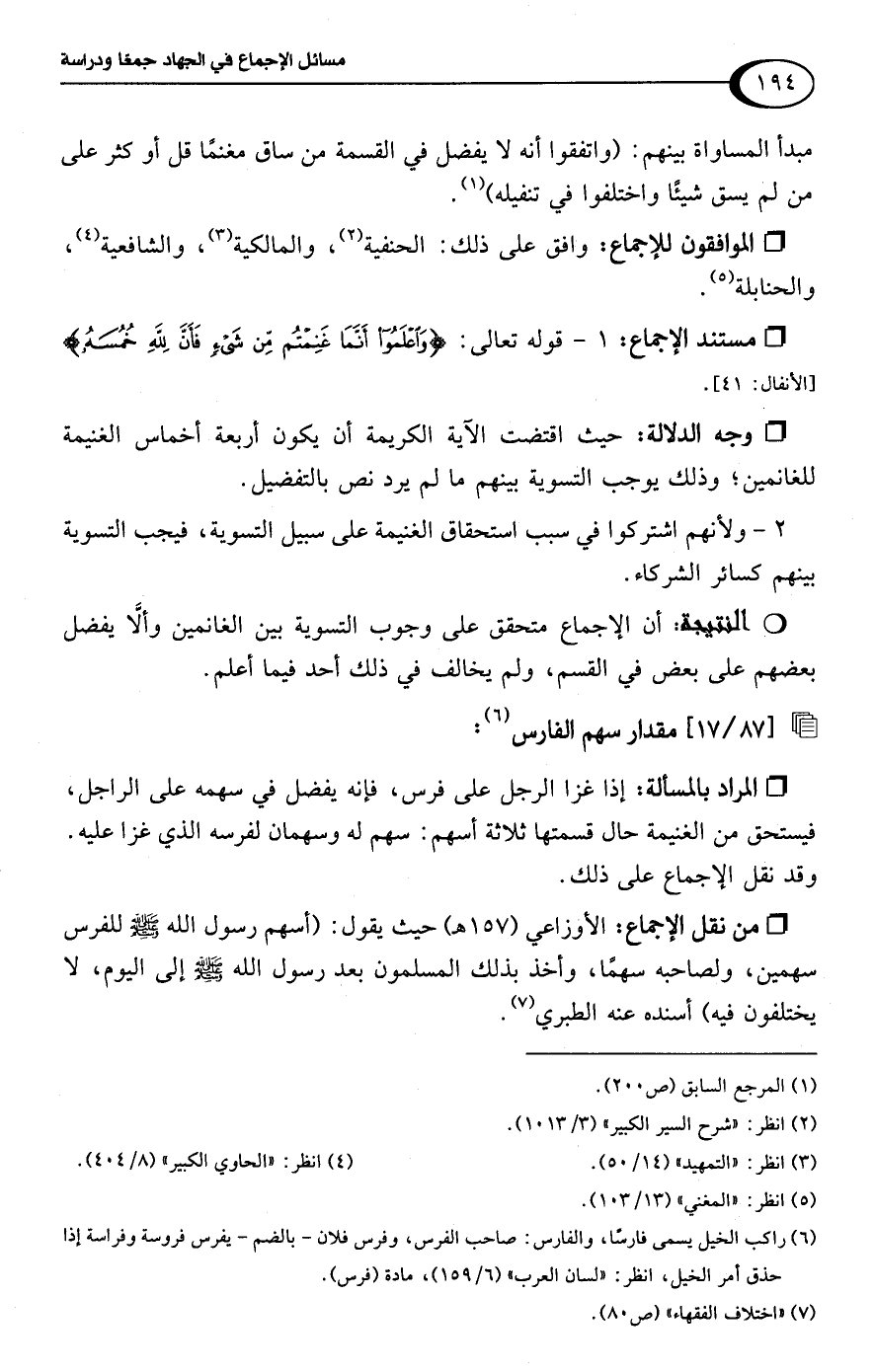 • من نقل الإجماع: الأوزاعي (157 هـ) حيث يقول: (أسهم رسول اللَّه -صلى اللَّه عليه وسلم- للفرس سهمين، ولصاحبه سهمًا، وأخذ بذلك المسلمون بعد رسول اللَّه -صلى اللَّه عليه وسلم- إلى اليوم، لا يختلفون فيه) أسنده عنه الطبري (¬7).