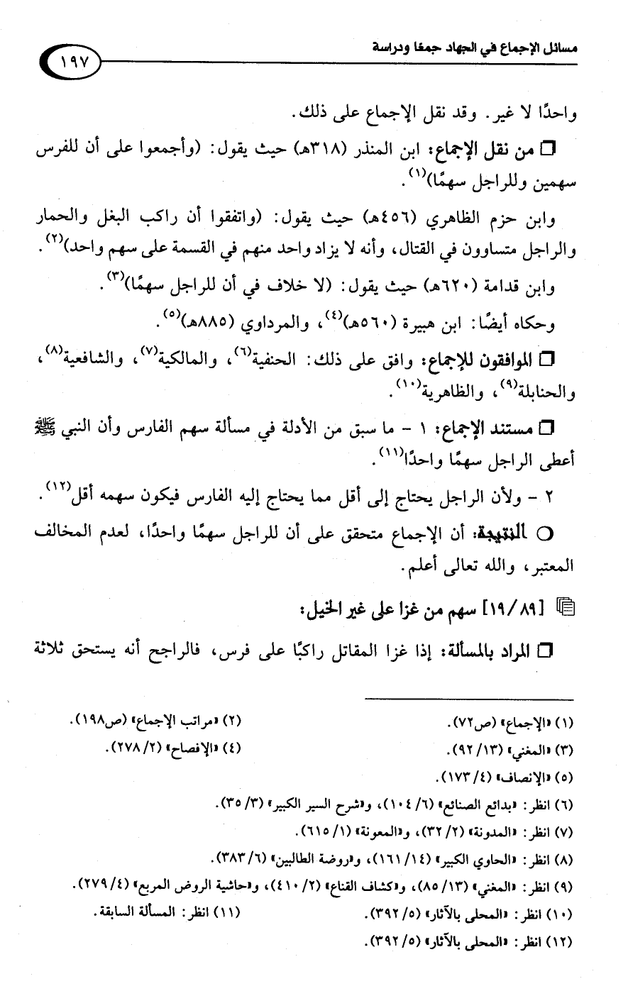 • من نقل الإجماع: ابن المنذر (318 هـ) حيث يقول: (وأجمعوا على أن للفرس سهمين وللراجل سهمًا) (¬1).