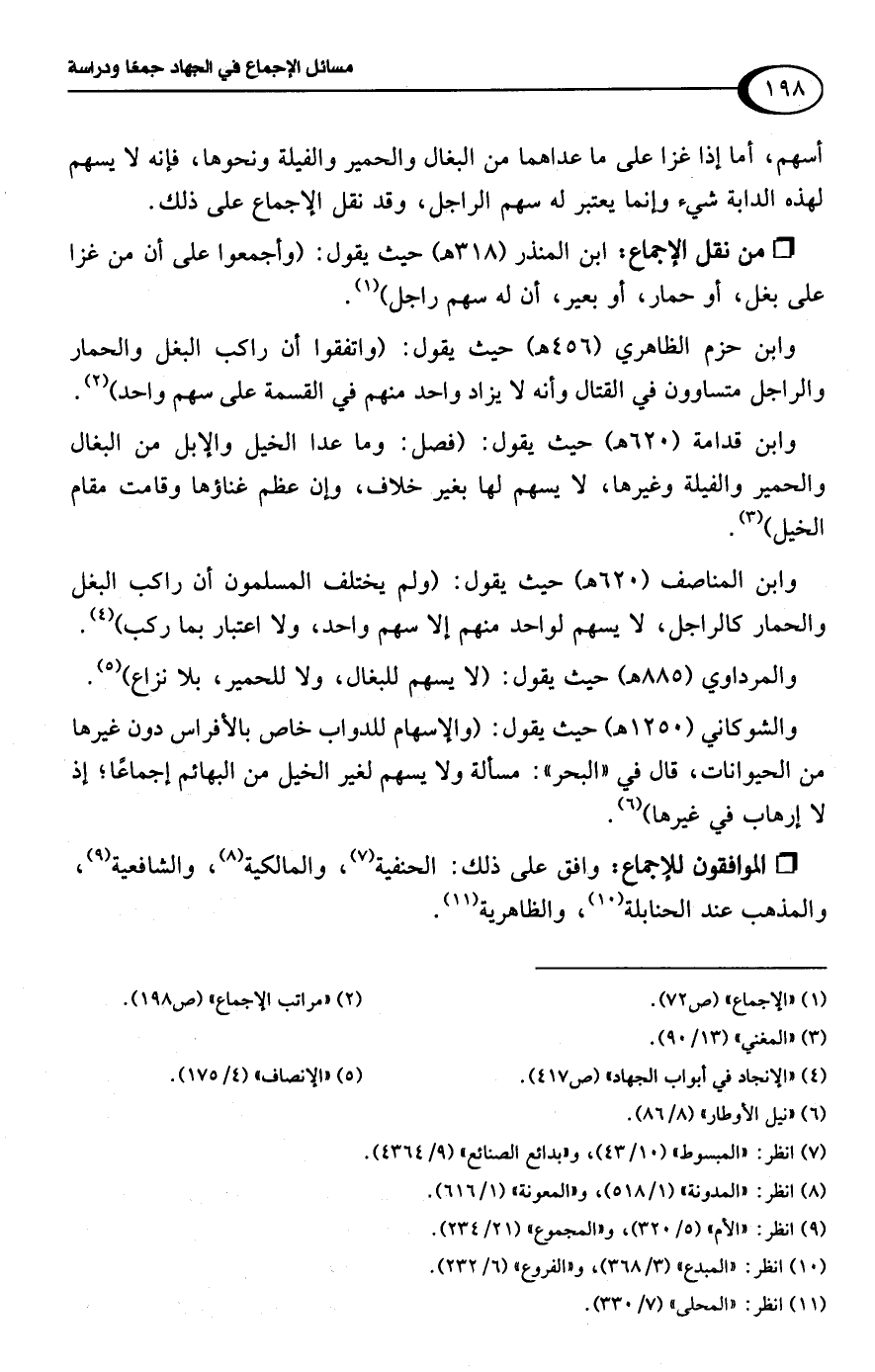 وابن حزم الظاهري (456 هـ) حيث يقول: (واتفقوا أن راكب البغل والحمار والراجل متساوون في القتال وأنه لا يزاد واحد منهم في القسمة على سهم واحد) (¬2).