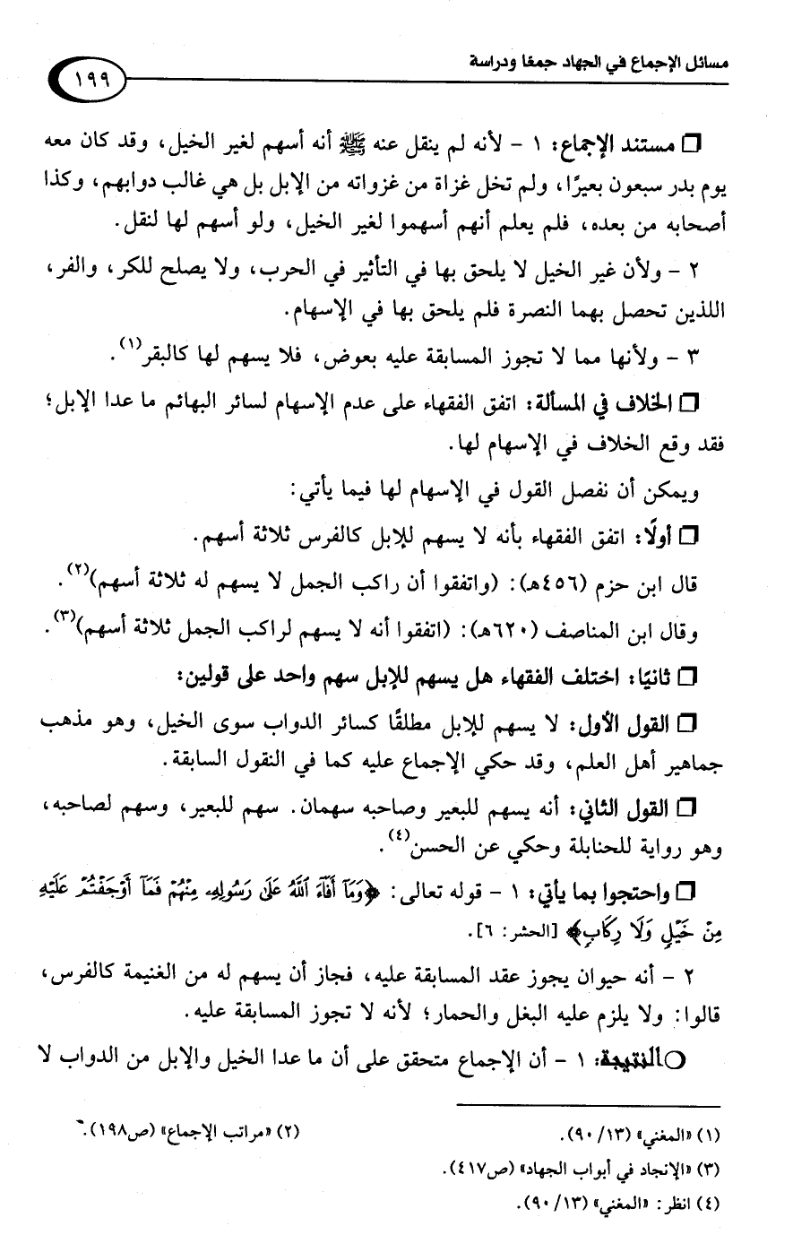 وقال ابن المناصف (620 هـ): (اتفقوا أنه لا يسهم لراكب الجمل ثلاثة أسهم) (¬3).