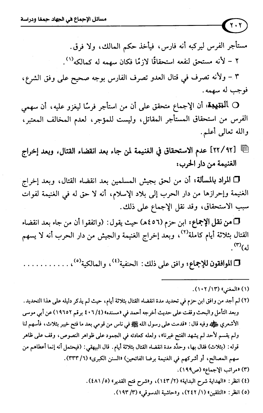 • من نقل الإجماع: ابن حزم (456 هـ) حيث يقول: (واتفقوا أن من جاء بعد انقضاء القتال بثلاثة أيام كاملة (¬2)، وبعد إخراج الغنيمة والجيش من دار الحرب أنه لا يسهم له) (¬3).