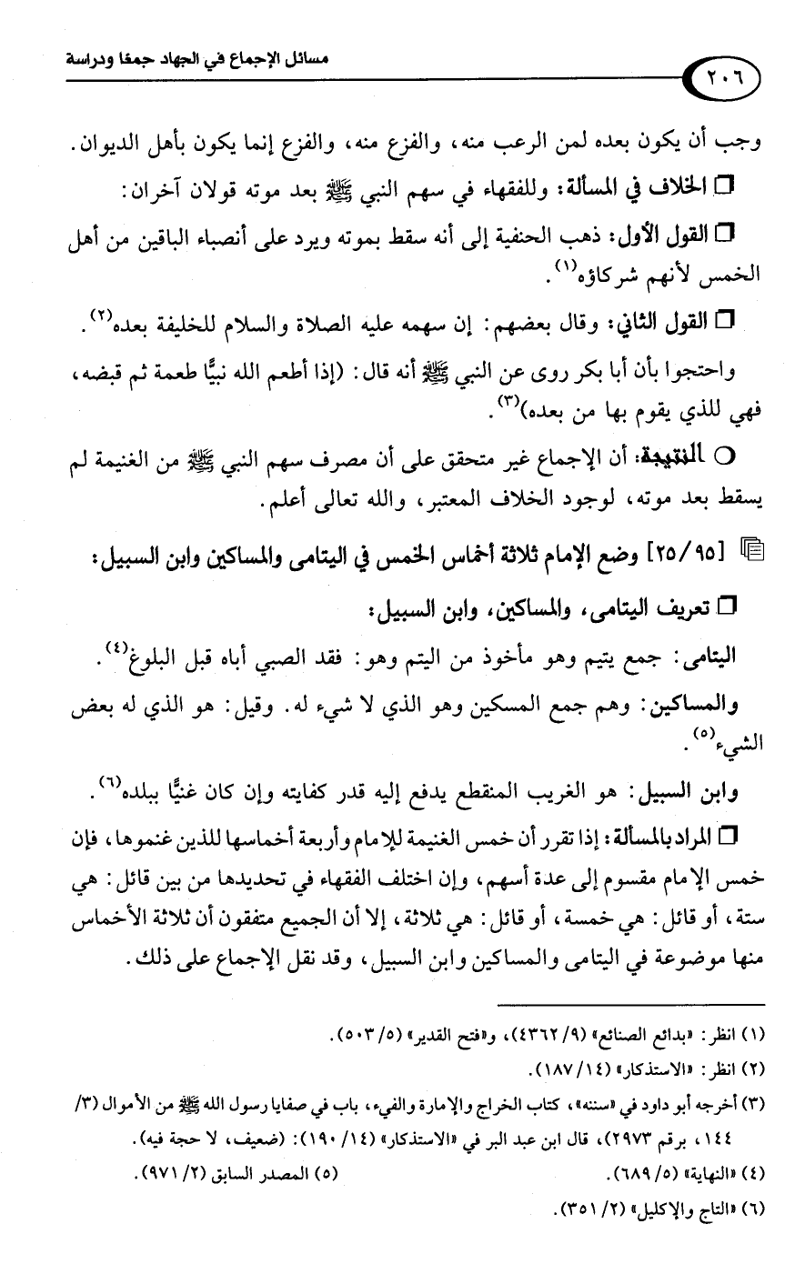 واحتجوا بأن أبا بكر روى عن النبي -صلى اللَّه عليه وسلم- أنه قال: (إذا أطعم اللَّه نبيًّا طعمة ثم قبضه، فهي للذي يقوم بها من بعده) (¬3).Rأن الإجماع غير متحقق على أن مصرف سهم النبي -صلى اللَّه عليه وسلم- من الغنيمة لم يسقط بعد موته، لوجود الخلاف المعتبر، واللَّه تعالى أعلم.