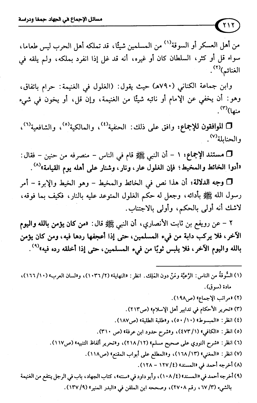 وابن جماعة الكناني (790 هـ) حيث يقول: (الغلول في الغنيمة: حرام باتفاق، وهو: أن يخفي عن الإمام أو نائبه شيئًا من الغنيمة، وإن قل، أو يخون في شيء منها) (¬3).