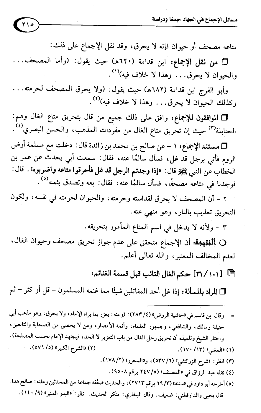 3 - ولأنه لا يدخل في اسم المتاع المأمور بتحريقه.Rأن الإجماع متحقق على عدم جواز تحريق مصحف وحيوان الغال، لعدم المخالف المعتبر، واللَّه تعالى أعلم.