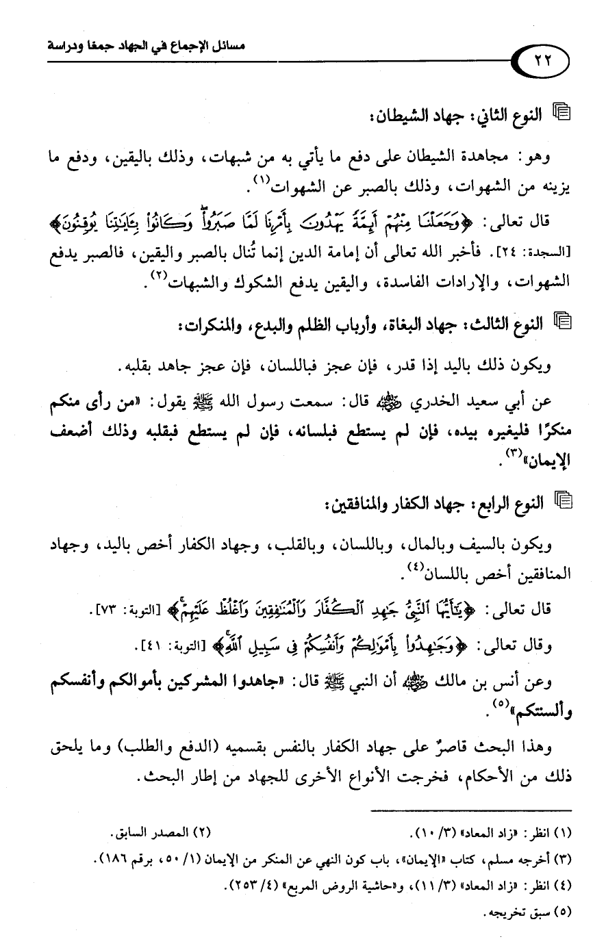 وهذا البحث قاصرٌ على جهاد الكفار بالنفس بقسميه (الدفع والطلب) وما يلحق ذلك من الأحكام، فخرجت الأنواع الأخرى للجهاد من إطار البحث.