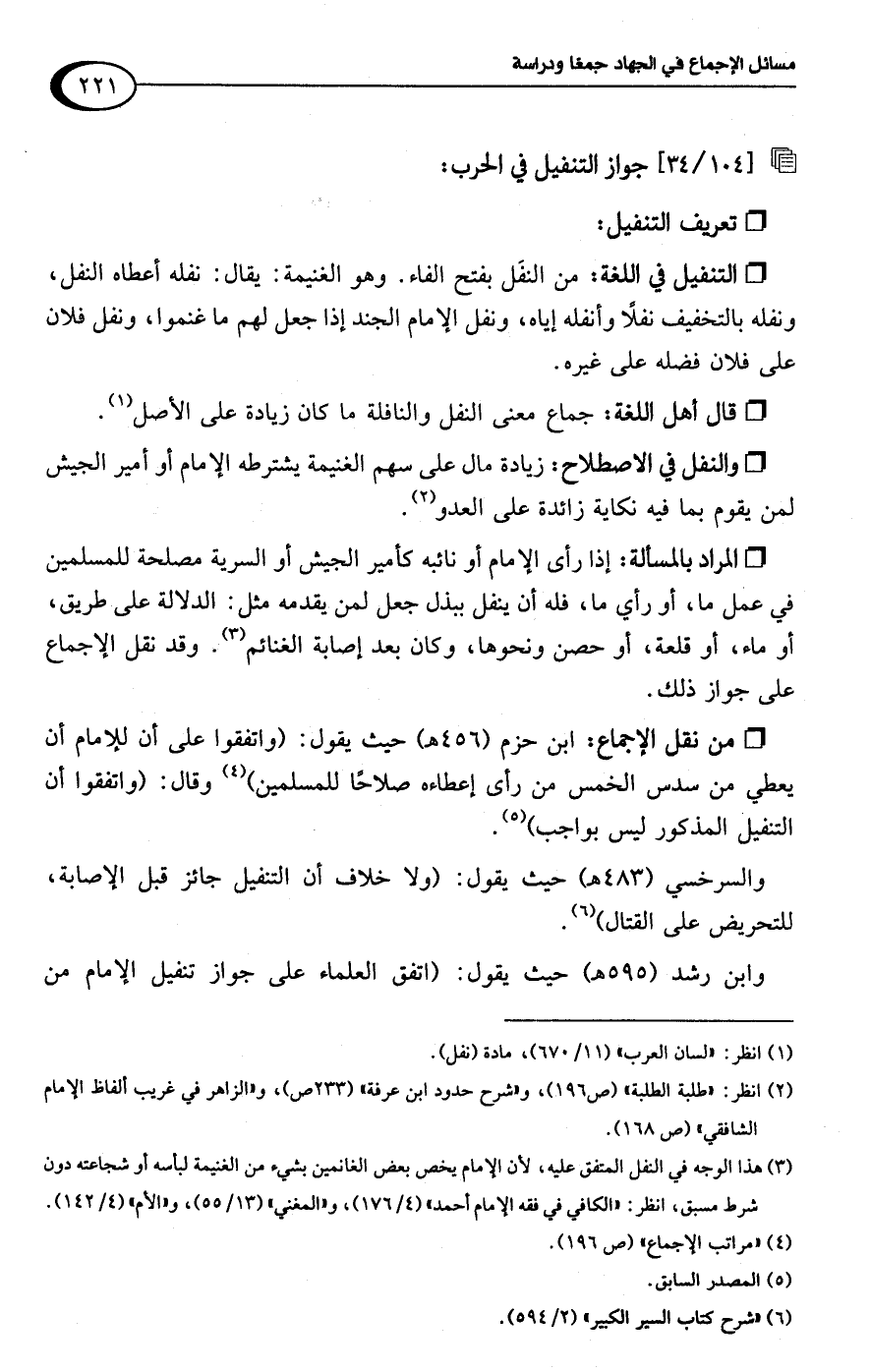 • من نقل الإجماع: ابن حزم (456 هـ) حيث يقول: (واتفقوا على أن للإمام أن يعطي من سدس الخمس من رأى إعطاءه صلاحًا للمسلمين) (¬4) وقال: (واتفقوا أن التنفيل المذكور ليس بواجب) (¬5).