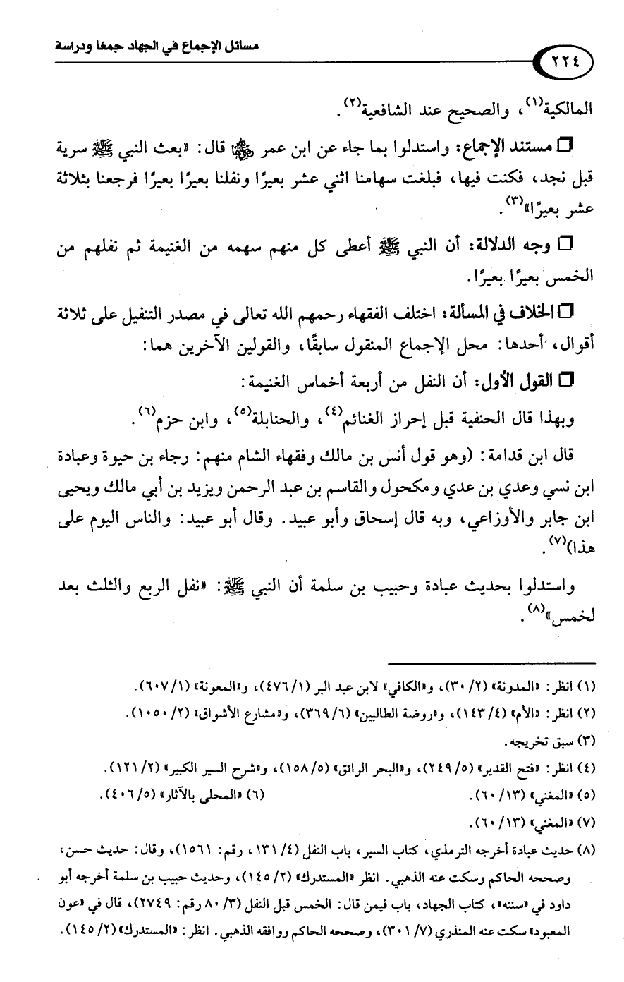 • مستند الإجماع: واستدلوا بما جاء عن ابن عمر -رضي اللَّه عنهما- قال: "بعث النبي -صلى اللَّه عليه وسلم- سرية قبل نجد، فكنت فيها، فبلغت سهامنا اثني عشر بعيرًا ونفلنا بعيرًا بعيرًا فرجعنا بثلاثة عشر بعيرًا" (¬3).