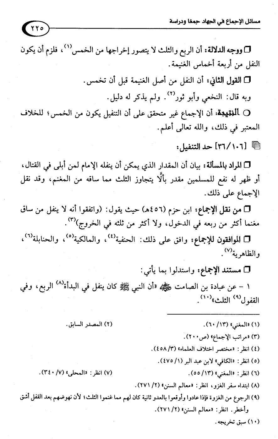 • من نقل الإجماع: ابن حزم (456 هـ) حيث يقول: (واتفقوا أنه لا ينفل من ساق مغنما أكثر من ربعه في الدخول، ولا أكثر من ثلثه في الخروج) (¬3).