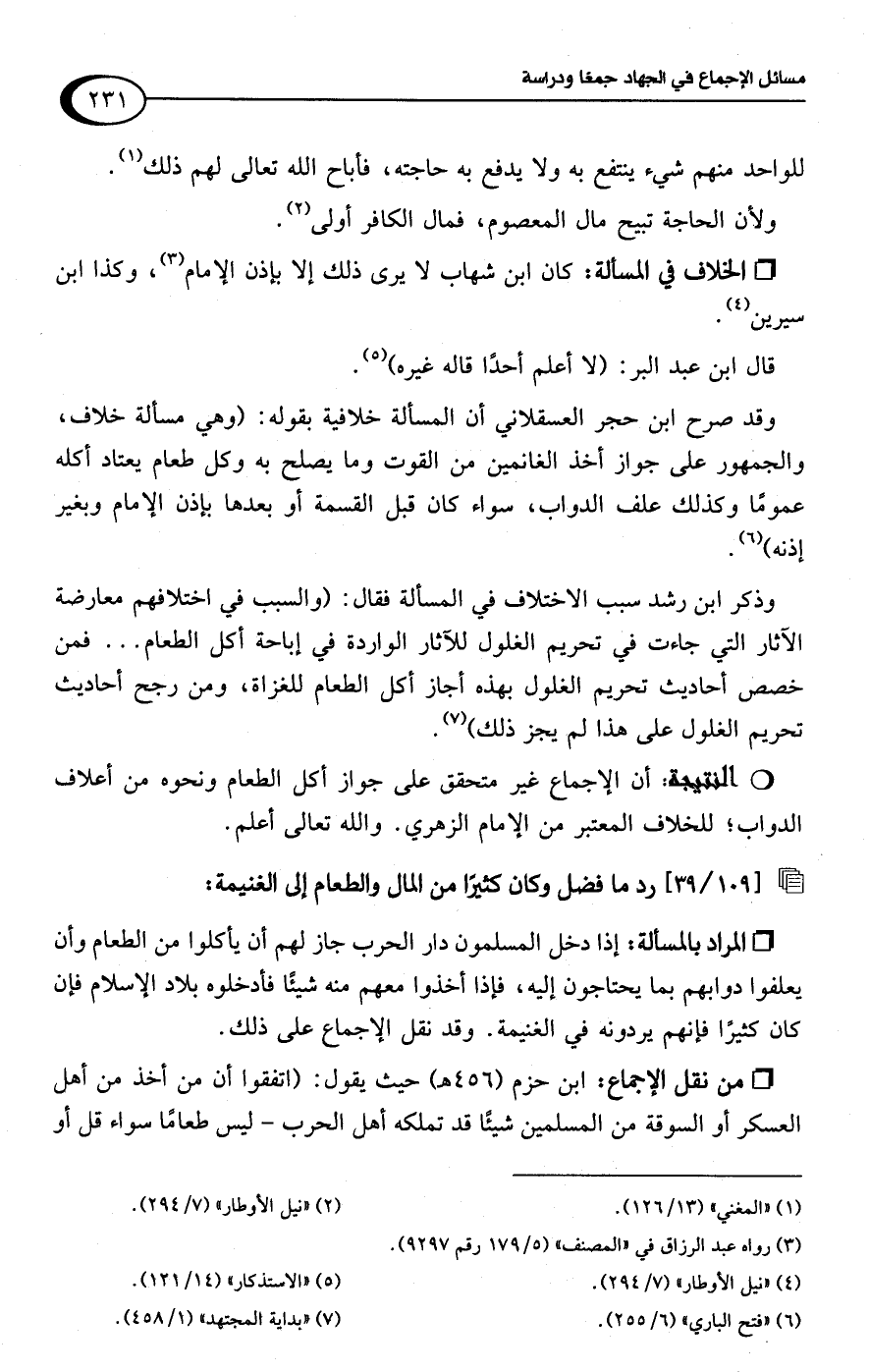 وذكر ابن رشد سبب الاختلاف في المسألة فقال: (والسبب في اختلافهم معارضة الآثار التي جاءت في تحريم الغلول للآثار الواردة في إباحة أكل الطعام. . . فمن خصص أحاديث تحريم الغلول بهذه أجاز أكل الطعام للغزاة، ومن رجح أحاديث تحريم الغلول على هذا لم يجز ذلك) (¬7).Rأن الإجماع غير متحقق على جواز أكل الطعام ونحوه من أعلاف الدواب؛ للخلاف المعتبر من الإمام الزهري. واللَّه تعالى أعلم.