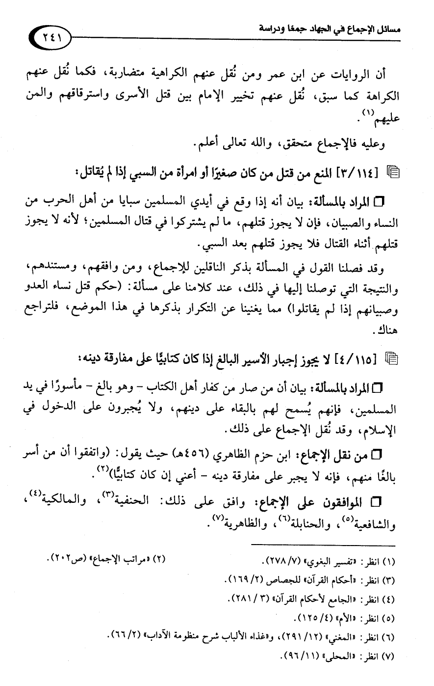 • من نقل الإجماع: ابن حزم الظاهري (456 هـ) حيث يقول: (واتفقوا أن من أسر بالغًا منهم، فإنه لا يجبر على مفارقة دينه -أعني إن كان كتابيًّا) (¬2).