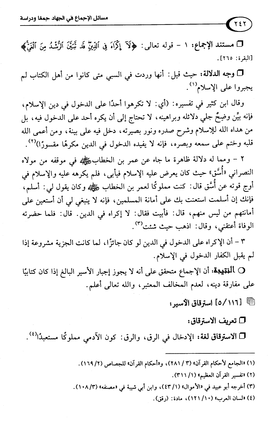 3 - أن الإكراه على الدخول في الدين لو كان جائزًا، لما كانت الجزية مشروعة إذا لم يقبل الكفار الدخول في الإسلام.Rأن الإجماع متحقق على أنه لا يجوز إجبار الأسير البالغ إذا كان كتابيًا على مفارقة دينه، لعدم المخالف المعتبر، واللَّه تعالى أعلم.
