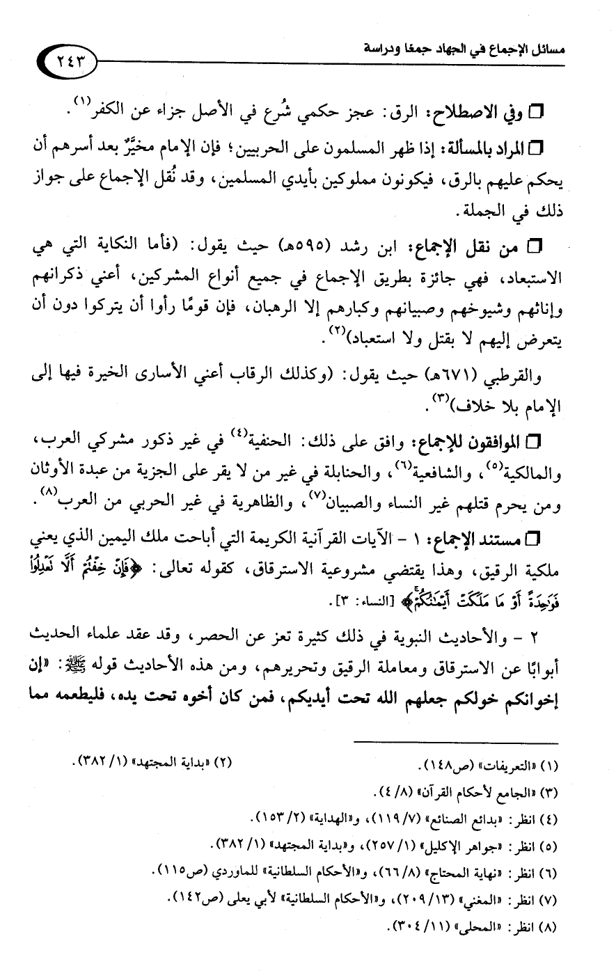 1 - الآيات القرآنية الكريمة التي أباحت ملك اليمين الذي يعني ملكية الرقيق، وهذا يقتضي مشروعية الاسترقاق، كقوله تعالى: {فَإِنْ خِفْتُمْ أَلَّا تَعْدِلُوا فَوَاحِدَةً أَوْ مَا مَلَكَتْ أَيْمَانُكُمْ} [النساء: 3].