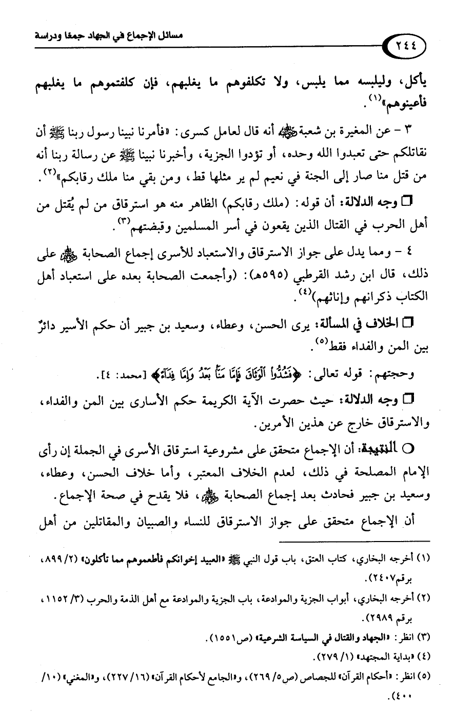4 - ومما يدل على جواز الاسترقاق والاستعباد للأسرى إجماع الصحابة -رضي اللَّه عنهم- على ذلك، قال ابن رشد القرطبي (595 هـ): (وأجمعت الصحابة بعده على استعباد أهل الكتاب ذكرانهم وإناثهم) (¬4).