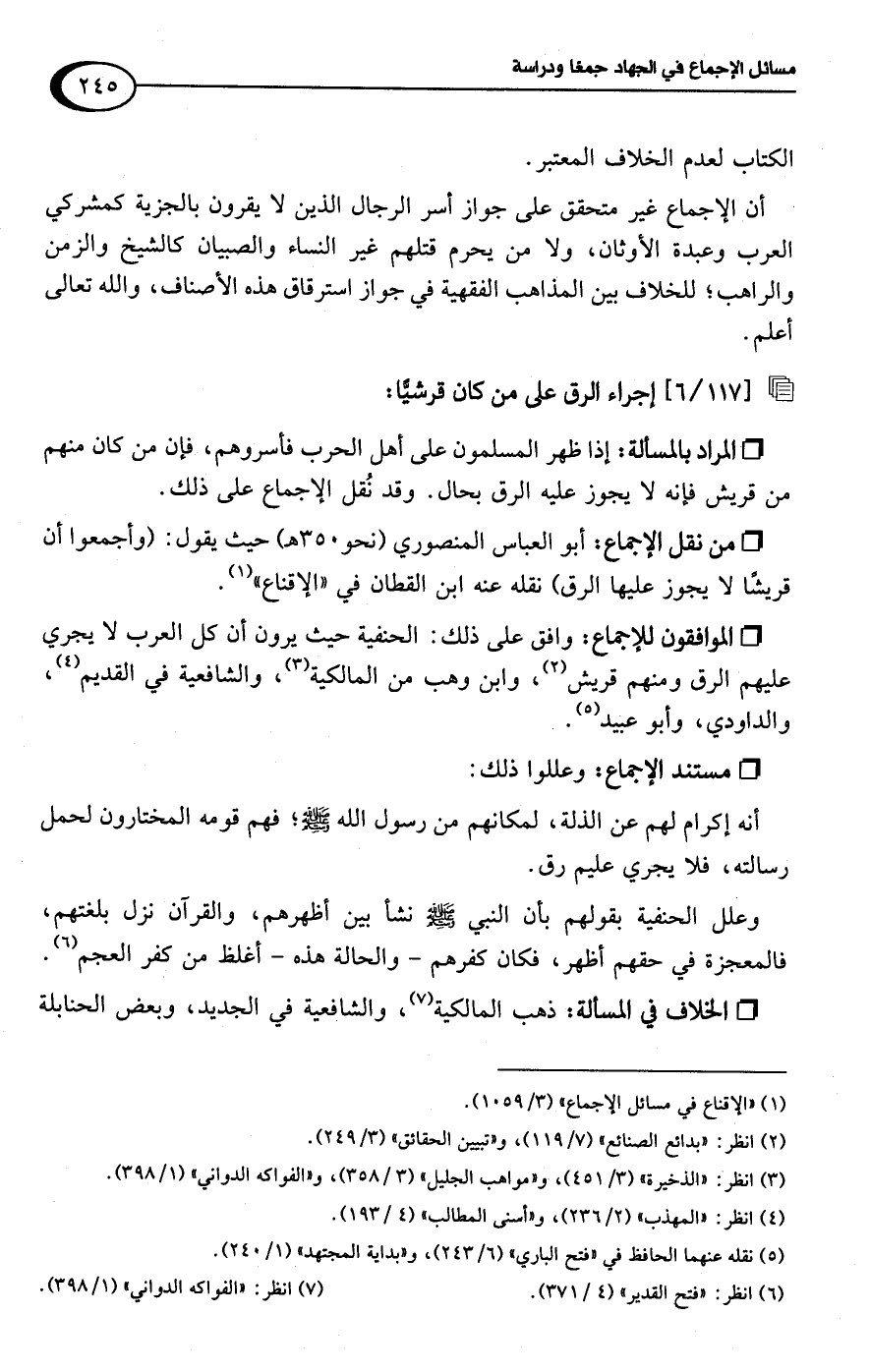 • الموافقون للإجماع: وافق على ذلك: الحنفية حيث يرون أن كل العرب لا يجري عليهم الرق ومنهم قريش (¬2)، وابن وهب من المالكية (¬3)، والشافعية في القديم (¬4)، والداودي، وأبو عبيد (¬5).
