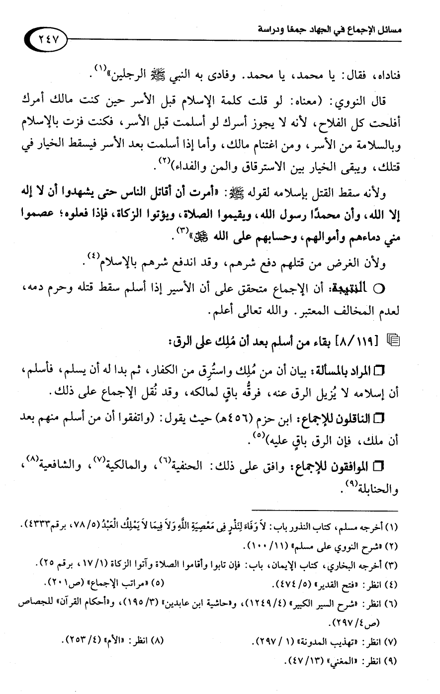 * الناقلون للإجماع: ابن حزم (456 هـ) حيث يقول: (واتفقوا أن من أسلم منهم بعد أن ملك، فإن الرق باقٍ عليه) (¬5).