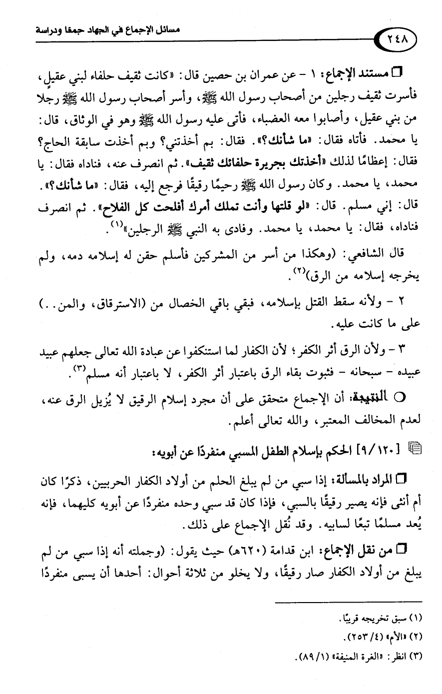 • من نقل الإجماع: ابن قدامة (620 هـ) حيث يقول: (وجملته أنه إذا سبي من لم يبلغ من أولاد الكفار صار رقيقًا، ولا يخلو من ثلاثة أحوال: أحدها أن يسبى منفردًا