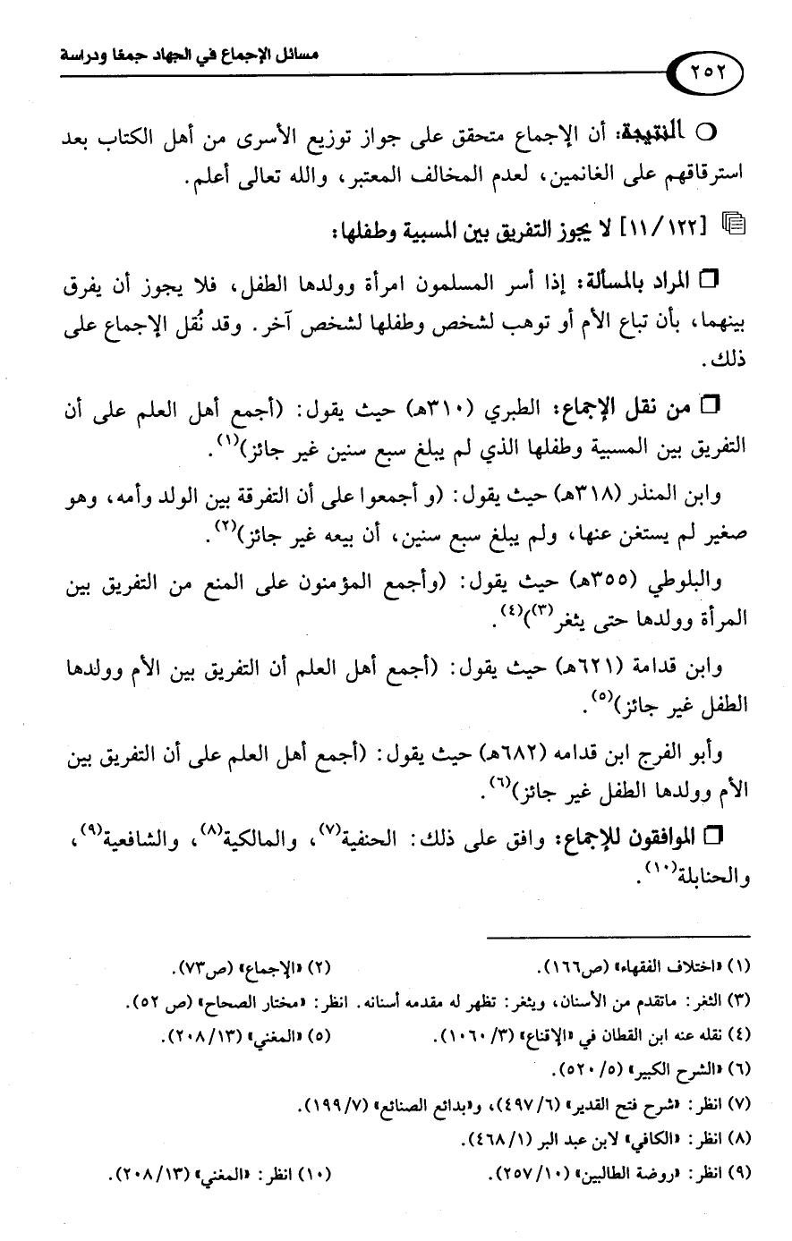 • من نقل الإجماع: الطبري (310 هـ) حيث يقول: (أجمع أهل العلم على أن التفريق بين المسبية وطفلها الذي لم يبلغ سبع سنين غير جائز) (¬1).